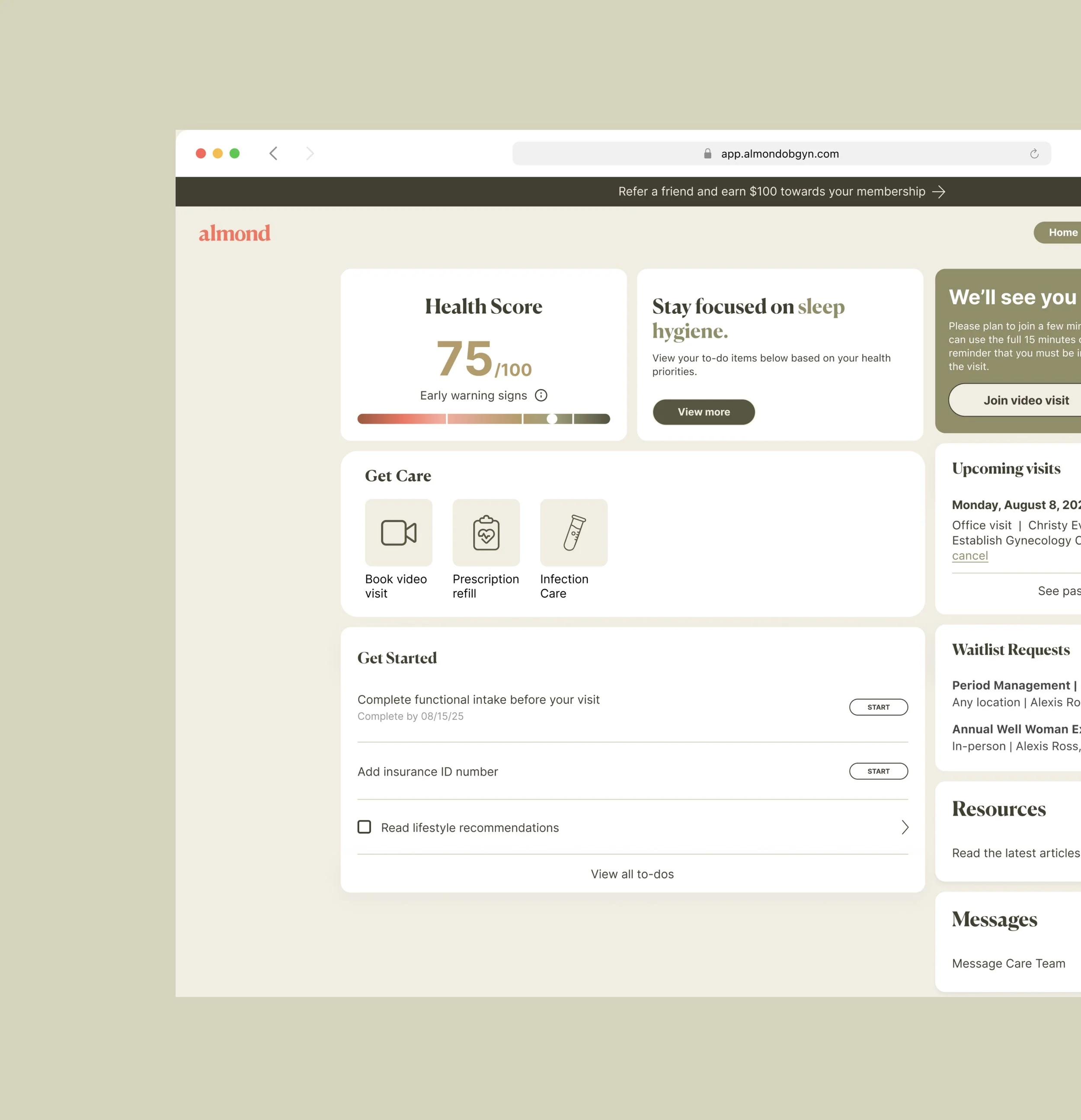 Almond is reimagining ObGyn care by providing a root cause, functional approach both in-person and over video—focusing on lab testing and in-depth condition-specific service offerings. I launched their new brand and website and lead the user experience of their online booking experience as well as their patient and provider dashboard.
